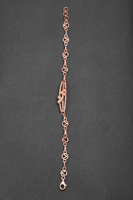 The bracelet is designed? in sleek silver and plated in rose gold, like a lane with tiny circular frames with a letter V curvature. The middle frame is embedded with tiny stones and a bigger letter V and a heart shape to signify the path of victory won by love.